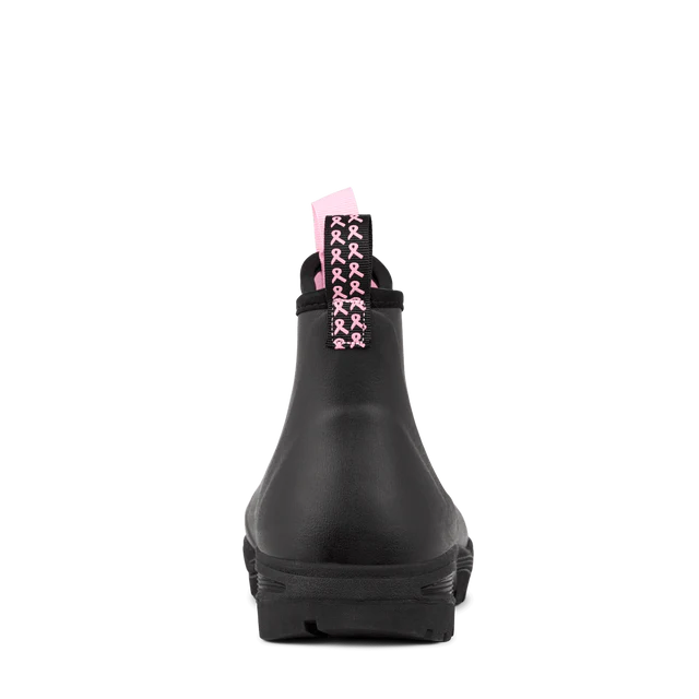 Bemærk, at disse sorte gummistøvler er designet med omsorgsfuld opmærksomhed på Støt Brysternes genkendelige lyserød farve og sløjfen, der smukt pryder den ene strop.