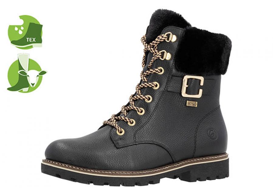 Damestøvle fra Remonte med en tex membran, som gør støvlen vandtæt. Støvlen er udstyret med både snører og lynlås.